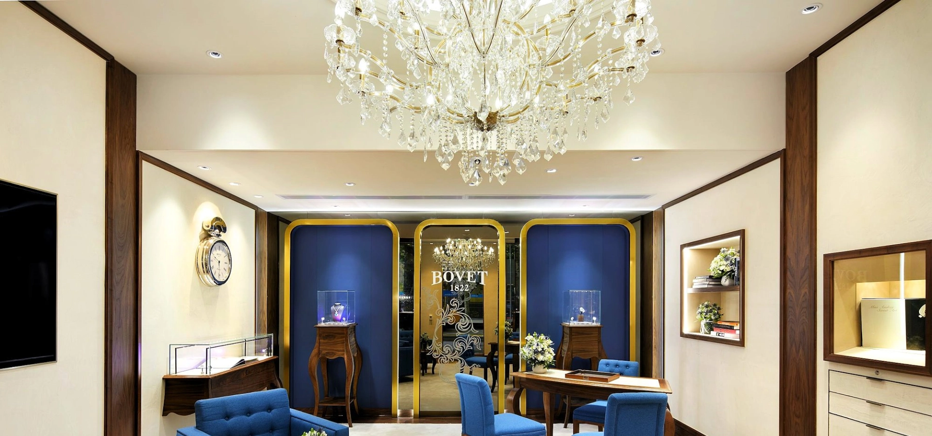Warm walnut joinery, soft-cream wall finishes and rich blue upholstery set a sophisticated and inviting palette. A central crystal chandelier adds height and visual drama, while display counters and wall vitrines with bronze-toned frames present each timepiece with precision and poise. Lighting is layered—under-cabinet, accent and ambient—ensuring that every surface and object is carefully modulated. Concealed service integration supports clean sight-lines and unencumbered presentation.
