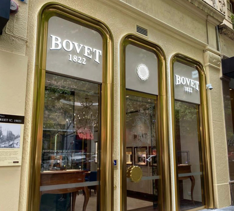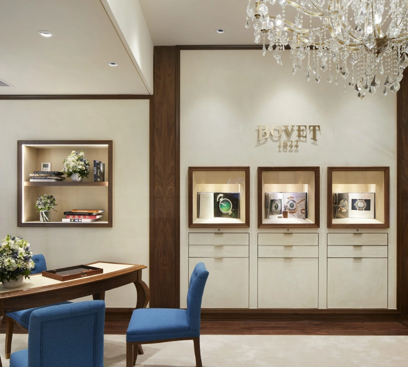 The layout guides visitors from a welcoming reception lounge into a focused display zone, enabling both discovery and contemplative viewing. Every detail—from the book-matched timber grain to the flush hardware and refined material junctions—has been executed with exacting care. The result is a boutique that embodies Bovet’s ethos of timeless elegance, placing craftsmanship and thoughtful design at the heart of the retail experience.