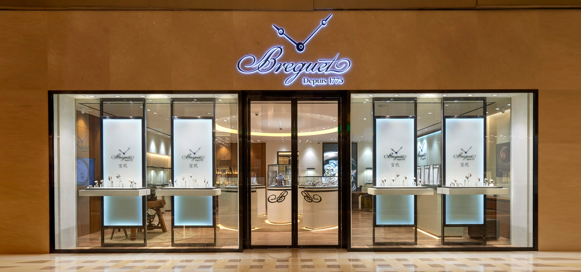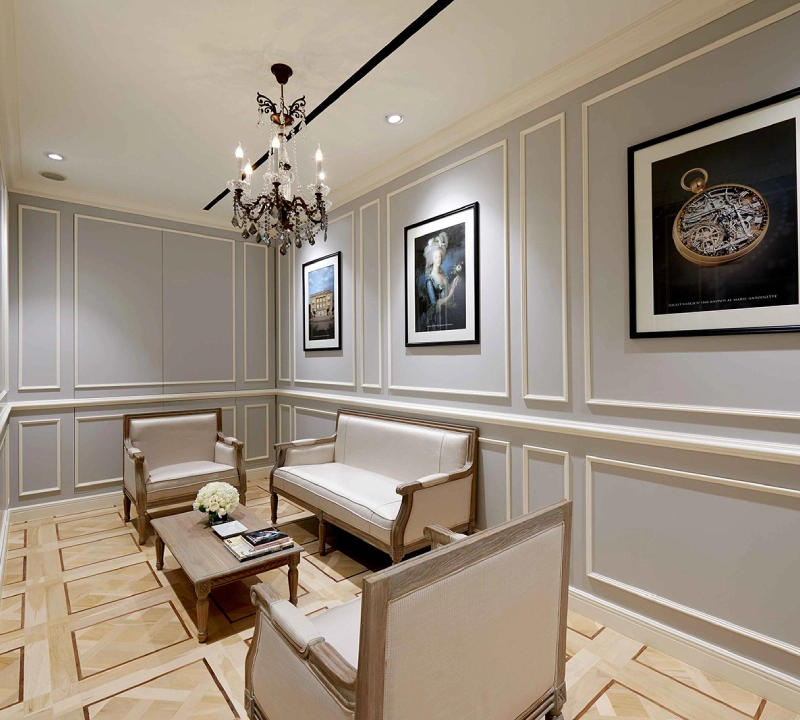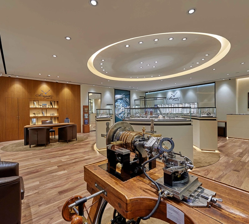 The interior palette blends rich walnut wood, engraved glass, and soft-toned marble to provide a refined backdrop for the maison’s timepieces. Bespoke joinery and display cases are meticulously designed to showcase each collection with clarity, while integrated lighting casts a soft, diffused glow across counters and walls, accentuating both texture and form. The spatial layout balances public engagement with private consultation areas, allowing visitors to journey through Breguet’s collections, from the Classique and Tradition lines to the Marine and Reine de Naples. Subtle design elements, such as carpets inspired by guilloché patterns and fluted furniture edges, reinforce the brand’s identity and invite visitors to experience the artistry and technical mastery of Breguet.