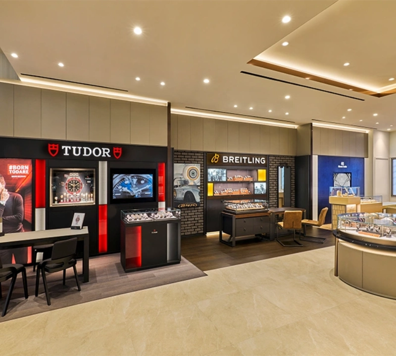 The design is conceived as a composed interior where clarity, craftsmanship, and quiet opulence converge in subtle harmony. The material palette draws upon warm timber wall panels, soft stone flooring and brushed metallic highlights, creating a tactile backdrop that enhances the presence of each timepiece. Display counters and wall-mounted vitrines are custom-fabricated with precision-fit joinery and integrated lighting, ensuring both functional excellence and visual calm. Light is layered through ambient ceiling planes, accent down-lights and under-counter illumination, all calibrated to emphasize texture and detail without distraction.
