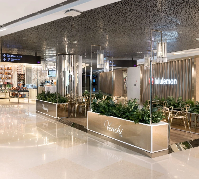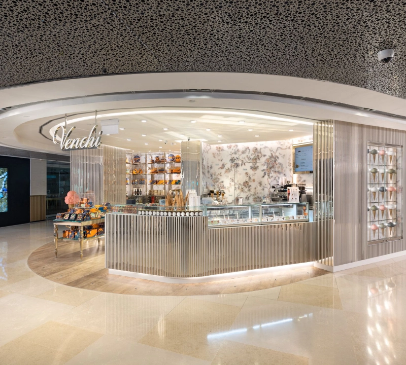 Technical execution included concealed MEP routing to support refrigeration, plumbing, and café services within a limited footprint, maintaining uncluttered sightlines and customer comfort. Precision coordination was required to complete works in live mall conditions, minimising disruption to surrounding tenants while achieving premium finishes within a tight programme. Every detail reinforces Venchi’s premium identity, transforming a compact unit into a sensorial destination that blends luxury retail with café hospitality.